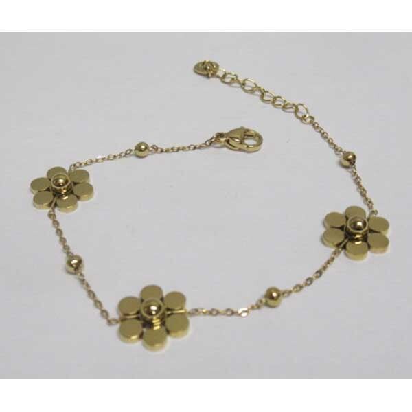 bracelet bijoux chaine 3 fleurs doré acier. Decouvrez choix bijoux en acier au grossiste. Le bracelet acier femme est un bijou d'une qualité irreprochable et anti-allérgène. Vous êtes à la recherche de votre grossiste en ligne de bijoux femme, c'est sur Accessoiresengros.com que vous trouverez le plus grand choix de bijoux femme: Des bracelets, des bagues, des colliers en similicuir, des boucles d'oreilles ou encore des parrures vendus en gros pour les détaillants et revendeurs de bijoux.Accessoiresengros, votre grossiste bijoux en ligne à tous les moments.