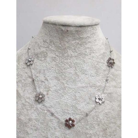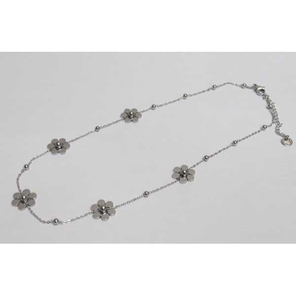 Collier chaine 5 fleurs en acier argenté inoxydable. Au grossiste pour faire vos achats de bijoux en acier inoxydable. Les bijoux acier pour femme sont irreprochable et anti-allérgène. Notre métier de grossiste de bijoux acier femme nous encourage à vous fournir des produits de haute qualité et un large choix pour satisfaire votre clientèle féminine. Vous êtes à la recherche de votre grossiste en ligne de bijoux femme, c'est sur Accessoiresengros.com que vous trouverez le plus grand choix de bijoux femme et homme: Des bracelets, des colliers, des bagues, des boucles d'oreilles ou encore des parrures vendus en gros pour les détaillants et revendeurs de bijoux.