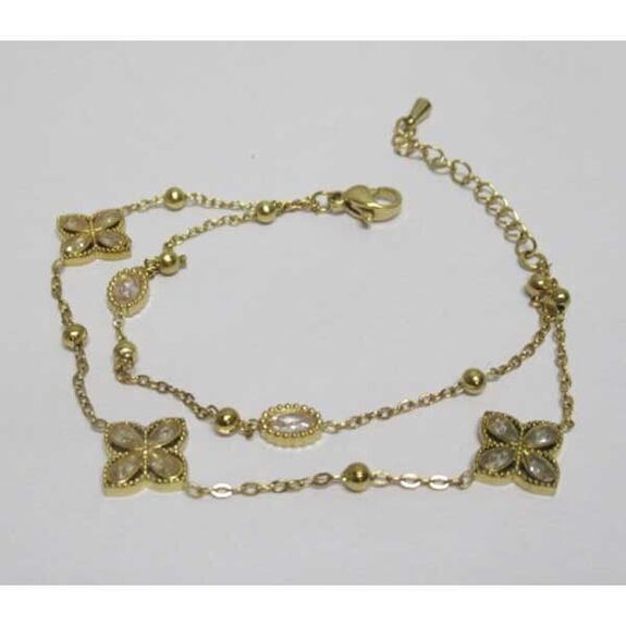bijoux bracelet double chaine trèfle cristal en acier doré. Bracelet acier de votre grossiste sur stock. Le bracelet acier femme est un bijou d'une qualité irreprochable et anti-allérgène. Vous êtes à la recherche de votre grossiste en ligne de bijoux femme, c'est sur Accessoiresengros.com que vous trouverez le plus grand choix de bijoux femme: Des bracelets, des bagues, des colliers en similicuir, des boucles d'oreilles ou encore des parrures vendus en gros pour les détaillants et revendeurs de bijoux.Accessoiresengros, votre grossiste bijoux en ligne à tous les moments.